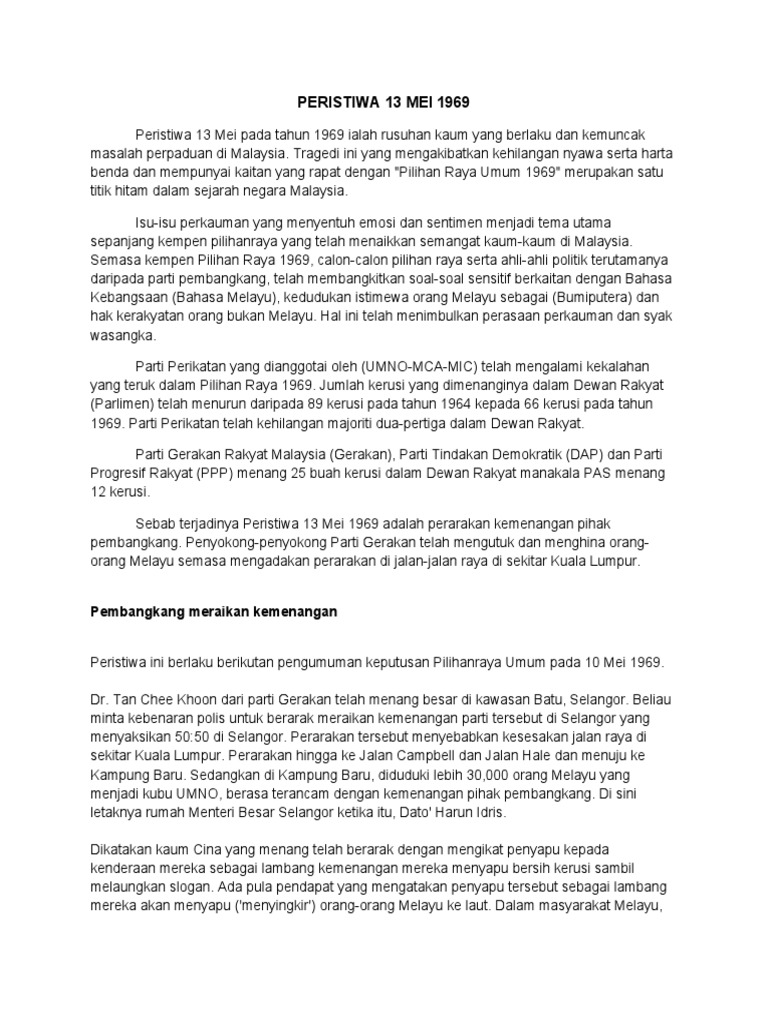 Peristiwa 13 mei memberi peringatan tentang kebenaran peribahasa kalah jadi abu, menang jadi arang kerana konflik itu merugikan semua kaum, selain menjejaskan imej negara di persada antarabangsa, katanya kepada bernama. Declassified documents on the malaysian riots of 1969. Katanya, kejadian itu turut menuntut keperluan. It can be concluded that the may 13 incident is an effective mechanism in controlling the conflict in the country. Faktor utama yang menyebabkan peristiwa 13 mei 1969 berlaku adalah perasaan tidak berpuas hati terhadap hak istimewa orang melayu.
