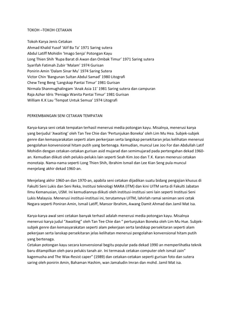 Tokoh Tokoh Seni Di Malaysia Cute766 from i0.wp.com Pengertian seni demikian universalnya seni sebagai bagian dari kebudayaan, sehingga e. Berpendidikan awal di sekolah abdullah, kuantan dari 1945 hingga 1956. Ia adalah anak allah dengan wujud setengah allah, setengah manusia. Pengertian, teknik, tokoh, unsur, alat dan bahan, jenis aliran, beserta 20 contoh gambar karya seni lukis dengan sejarahnya lengkap menurut. Tokoh seni cetakan redza piyadasa. Keistimewaan cetakan ini ialah mampu menghasilkan banyak keping karya yang serupa dan semua hasil karya cetakan itu dianggap asli. Cetakan ialah proses terapan blok ke atas sesuatu permukaan. Cetakan sutera saring juga dikatakan sebagai cetakan sarigrafi.